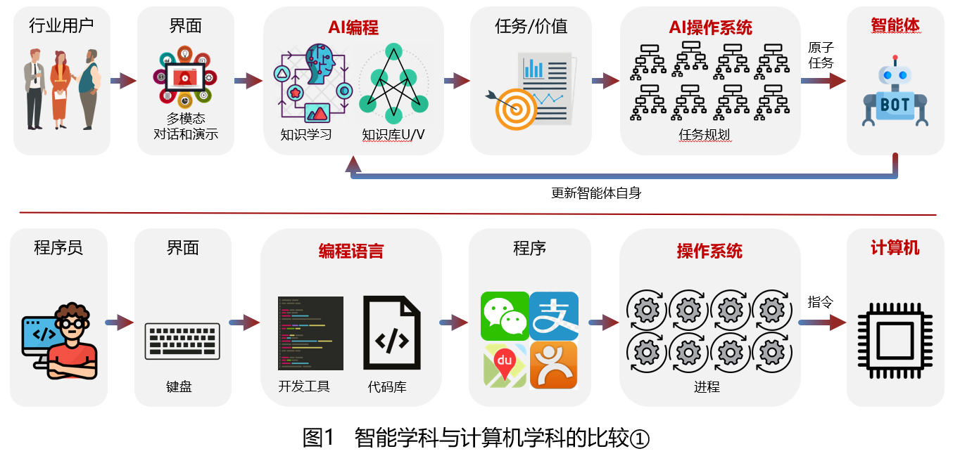 智能学科与计算机学科密切相关,不少高校的智能学科是由计算机科学与技术一级学科下的二级学科衍化而来。当前社会上非专业人士对智能概念的理解含糊不清,往往认为智能就是计算机。本质上,智能学科和计算机学科有着完全不同的学科内涵(见图1)。计算机学科的核心目标是“造计算机”,是研究计算机的设计与制造并利用计算机进行信息获取、表示、存储、处理、控制等的理论、原理、方法和技术的学科。程序员(用户)编制计算机能理解的语言 (程序),在计算机系统上运行,实现由性能驱动的计算功能。而智能学科的使命是“造智能体”,研究的对象是客观与主观混合的智能体,通过构造一个统一的理论与架构,解释智能体在物理与社会场景的“相互作用”中表现出的多个尺度和复杂度下的智能现象,如视觉识别与重建、自然语言理解、认知与常识推理、任务与运动规划、环境交互与具身智能、心智模型与认知架构、学习理论、价值体系、社会伦理等。智能体能够与行业用户进行自然语言的对话沟通,对齐知识、模型与价值观,在动态不确定场景中完成由价值驱动的各种复杂任务。