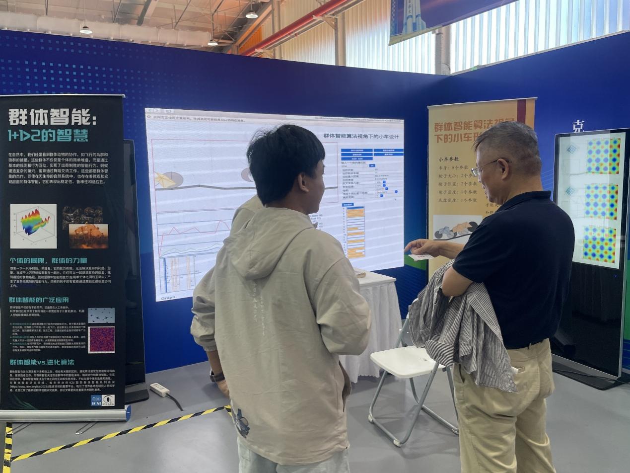 群体智能设计小车项目同样吸引了一群小学生。他们聚精会神观察着烟花算法迭代产生不同形状的小车,每次尝试都伴随着笑声和欢呼声。成年观众也对小车的自动化设计十分感兴趣。计算智能实验室的成员耐心解释了设计背后的科学原理,赢得了观众的赞誉和认可。