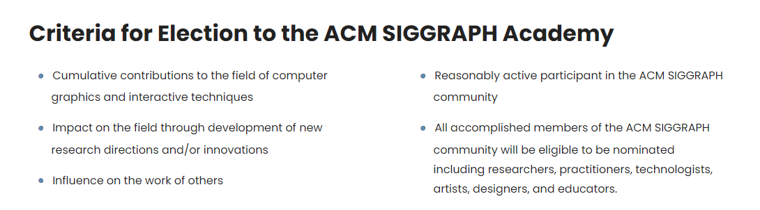 5月7日,该学院网站(https://www.siggraph.org/awards/acm-siggraph-academy)正式发布消息,宣布今年入选成员。