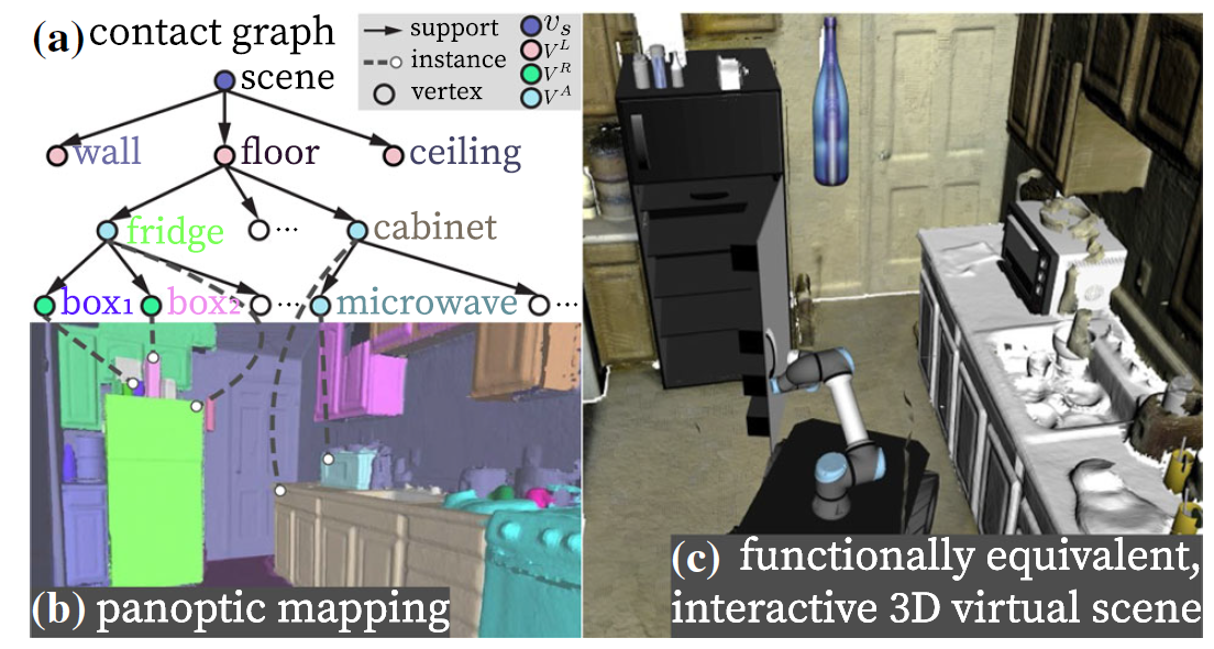 在虚拟环境中重建真实场景以支持机器人仿真并非一个简单的问题。主要的难点有三:一是如何在杂乱的真实场景中准确重建并分割出每个物体与结构的几何,并估计物体间的物理约束(比如支撑关系等);二是如何将重建出的不完整的几何形状替换成完整的、可交互的物体(例如CAD模型);三是如何将所有的这些信息有机融入某种通用的场景表达,同时帮助场景重建和机器人自主规划。