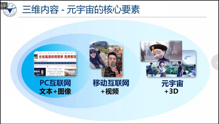 首先,周教授带着大家简要回顾了互联网及内容形式的发展历程,概括了从门户网站时期以文本图像为主的内容传播方式到移动互联网时期视频内容大量涌现的发展历程。他提到三维数字内容将会成为互联网下一个发展阶段中的一个核心要素,与其他内容形式一起构建丰富的内容生态。三维数字内容中一个重要的方面是对三维物体进行数字化表示和重建。