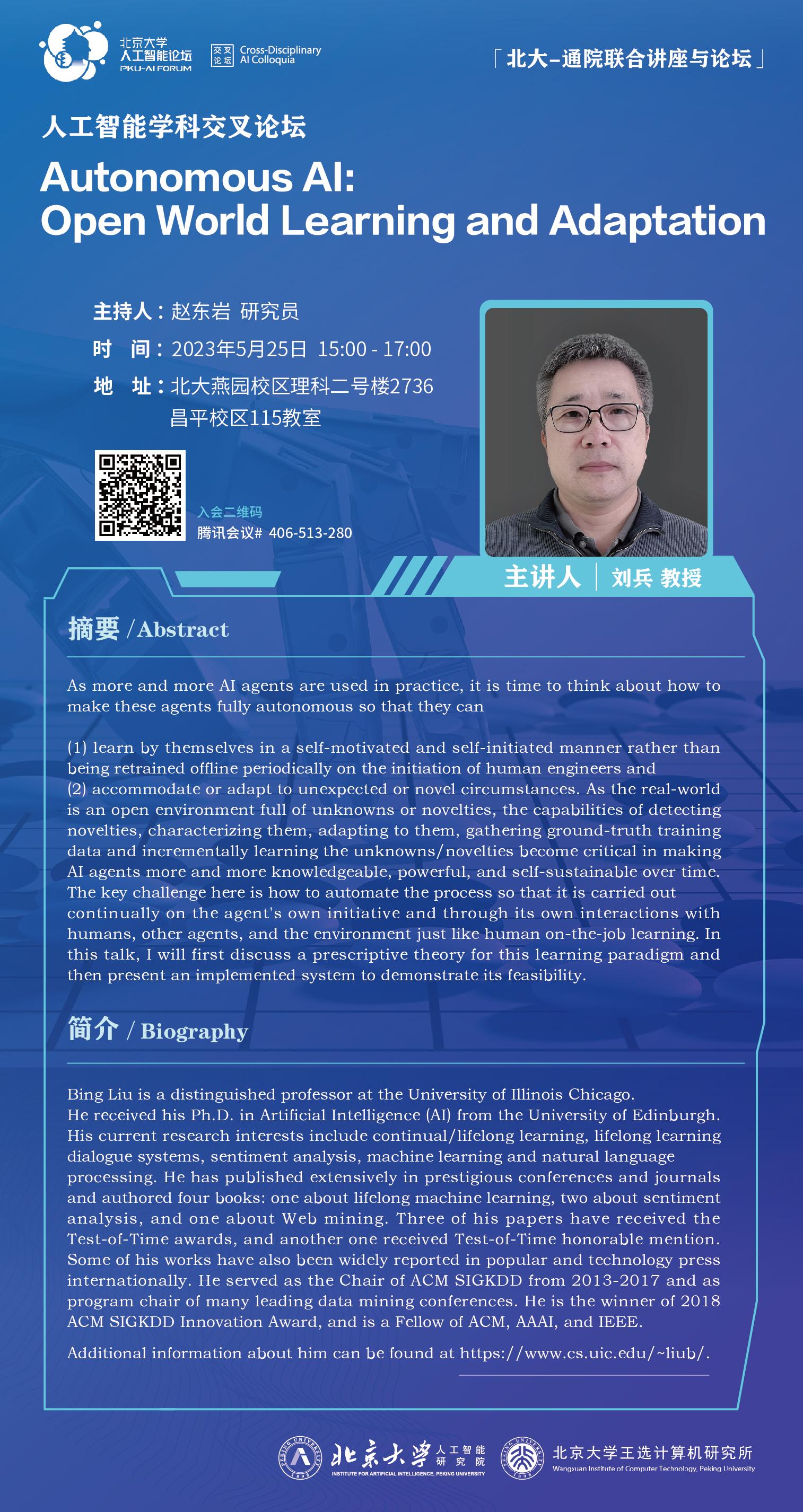 Bing Liu is a distinguished professor at the University of Illinois Chicago. He received his Ph.D. in Artificial Intelligence (AI) from the University of Edinburgh. His current research interests include continual/lifelong learning, lifelong learning dialogue systems, sentiment analysis, machine learning and natural language processing. He has published extensively in prestigious conferences and journals and authored four books: one about lifelong machine learning, two about sentiment analysis, and one about Web mining. Three of his papers have received the Test-of-Time awards, and another one received Test-of-Time honorable mention. Some of his works have also been widely reported in popular and technology press internationally.
